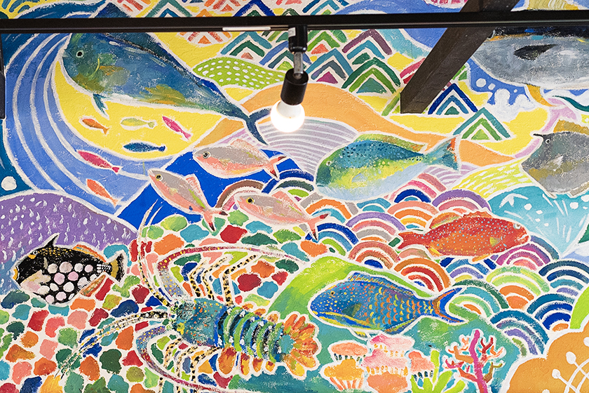 店内に入るとまず目に入るのが、カラフルな壁画。大将の妻・はなえさんが大好きな沖縄のアーティスト「SAVA」さんに描いてもらいました。やんばるの山から流れる川の情景、そこから海へ繋がり、すべてがつながっている「循環」をテーマに、やんばるの大自然の風景や、かつて漁師だった大将の思い入れのある漁船、海の幸がたくさん散りばめられています。
