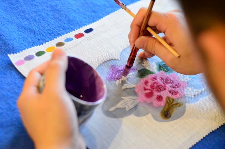 「祝いごとなど、おめでたいことが起こるタイミングで購入されることが多いのが僕らが関わっている紅型です。自分たちが作ったものはいつかはお嫁に行くわけですが、嫁ぎ先で喜んでもらえている場面を思い浮かべながら仕事をしていますね。アイデアをデザインに落とし込むことに始まって、最後の仕上げまで、ひとりで制作していきます。もちろん、簡単な仕事ではありません。手間ひまがとってもかかります。でも、購入してくださった人が身に着けているところを見たりすると、苦労が一気に報われるんです」。