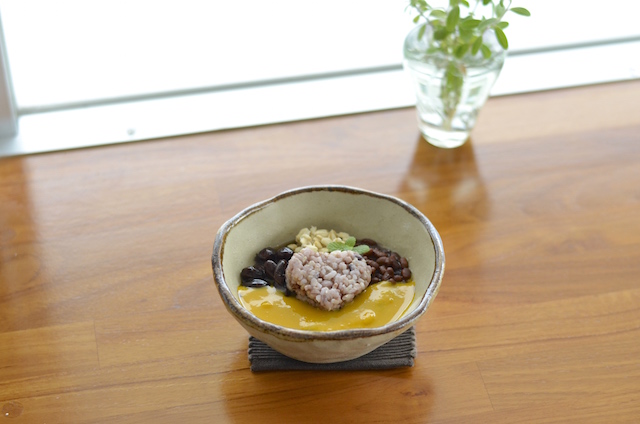お食事メニューが続きましたので、今度はデザートをご紹介しましょう。海を照らす月をイメージしたというパンプキンソースが印象的な『神の島・五穀ぜんざい』(500円)は、知念地区に昨年4月にオープンしたスペシャルティコーヒーの店「douce cafe nanjo」がお届けする珠玉のひと品。シンプルで眺めのいい店内からは青い海の向こうに久高島を望むことができるとあって、「神の島」久高島を迷うことなくコンセプトにしたそうです。五穀伝来の神話が残る久高島で育てられた小豆と、同じく久高島で作られた塩。身体に優しい食材が使われたぜんざいで、ひと口ごとに身体が内側から浄化されていくような気がします。