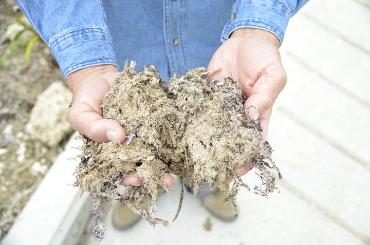 手のひらにあるのは「浜辺の茶屋」の前の浜から拾ってきた海草。海のミネラル分が雨の力でゆっくり溶け出し、植物に勢いをつけるのだそうだ。「これは道路を掃いて集めた枯葉。これを敷き詰めると保水性が高まるし、強烈な太陽光線によるダメージを和らげてくれる。厚く敷くと湿度が高くなりすぎるから、ちょうどいいのはこれくらいね。植物にとって重要なのは微生物。微生物がすくすく育つ環境をどう整えるかは、すべて野山での経験と先輩たちから受け継いだ知恵から学んだです」。大切にしているのはなるべく現場を知り、土地から学ぶこと。「本当に役立つのは本から学んだことではない」。