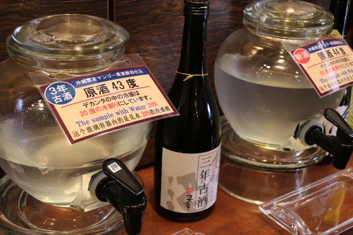 古酒(くーす)とは、泡盛を三年以上寝かせたもの。熟成させた酒である。