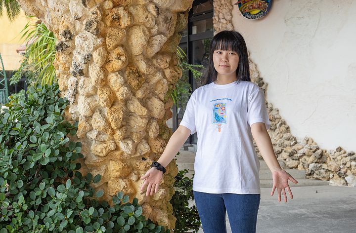 「沖縄らしくて“面白い”と思ってもらえるようなデザインにしたくて」と話す伊江 麻奈美(いえ まなみ)さんがデザインをした「シーサーアンダギー」は、シーサーをサーターアンダギーに包んで揚げてしまったという奇抜なアイデアTシャツです。背面にはシーサーアンダギーの作り方がプリントされ、とてもユニーク。