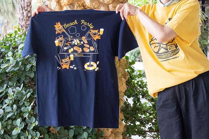 屋宜 彰代(やぎ あきよ)さんが手がけたTシャツに描かれているのは、ウチナーンチュが大好きなビーチパーティー(ビーチでバーベキューをしながら仲間と過ごすこと)。シーサーがお肉を焼き、ビールを飲みながらワイワイ楽しんでいます。こちらは大人用。子ども用のTシャツのグラスの中身はビールではなく、オレンジジュースになっています。