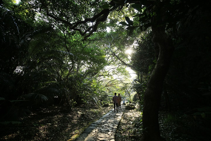 姿の見えない鳥の声、たくましく育つ樹々の息吹、南の島の原始的な森が広がっています。