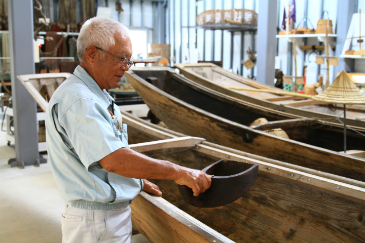 次に来館者から関心が高いのは、「ユートゥイ」と「ウェーク」です。サバニのなかに溜まった海水は、太陽に熱せられてお湯のように温まることから「ユートゥイ(湯取り)」と呼ばれるそう。現在のユートゥイはプラスチック製の洗剤容器を切り取ったものですが、かつてはリュウキュウマツの根っこを削って、サバニの船底の曲線に合わせてつくられていました。