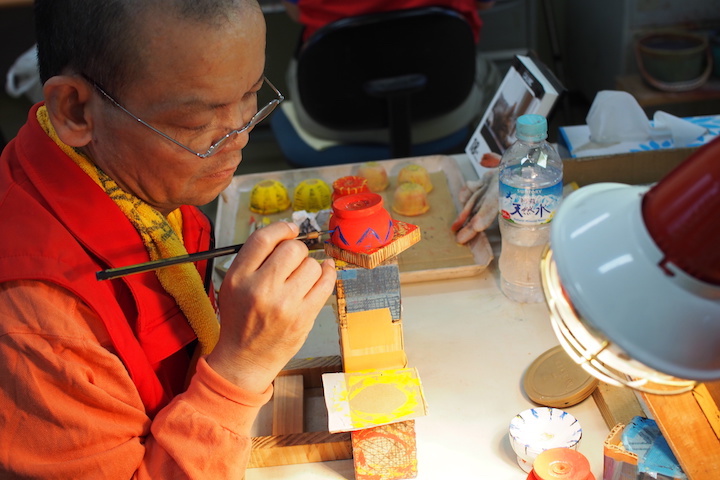絵付けを施すのは、この道40年以上の大ベテランさん。右手の自由がきかないため、左手だけで絵付けを行います。