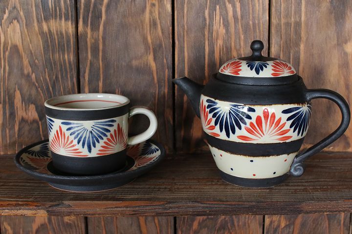 澄んだ青は沖縄の海をイメージし、赤で描かれたのはやちむんの伝統柄、菊や唐草をアレンジしたもの。色鮮やかな絵付けには、ひと目で引き込まれていきます。