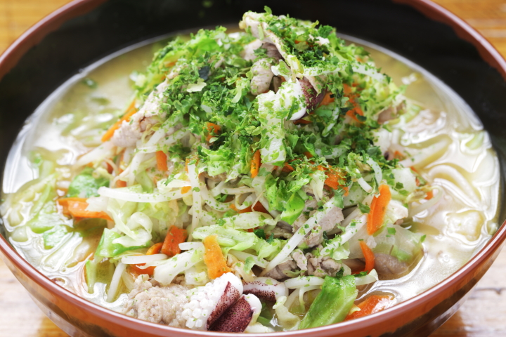しかし実は、「海人(うみんちゅ)そば」(900円 税込)こそが、最近の新定番! 直径はB5サイズほどの巨大な器に、麺は230g。その上を埋め尽くす具材の重量感たるや…。モヤシ、キャベツ、ニンジン、タマネギ、そして豚肉にカマボコと、てんこ盛りな野菜炒めの中に、イカやエビ、ムール貝にアサリ、ホタテなど新鮮な海の幸がたっぷり潜みます。