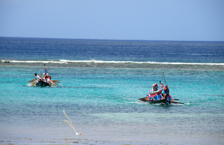 豊年祭では珍しい舟漕ぎ競漕があります。海をバックに、ミルク行列や舞踊、棒術なども。