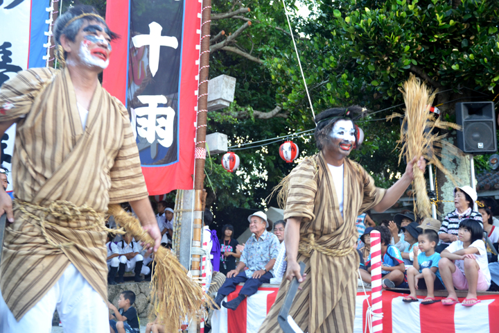石垣島の中心街、新川、石垣、大川、登野城の4つの字の豊年祭。1日目にはそれぞれの御嶽(うたき)で、棒術や獅子舞などの奉納芸能などが行われ、2日目は、新川にある御嶽に集結し、大勢の人が訪れ、ツナヌミン、大綱引きなどが盛大に行われます。