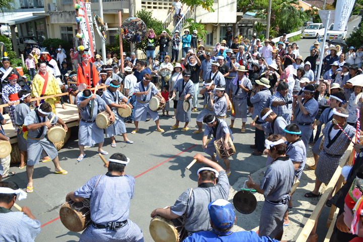 与那国ではなにごとも、太鼓でその場所を清めてから演目が行われます。奉納芸能や旗頭、与那国ならではのドゥンタという巻き踊り、そして、2年に一度大綱引きが。賑やかに行われ、見学者も多い地域がほとんどですが、日程や祭祀の内容も関係者にしか知らされない秘祭もあります。
