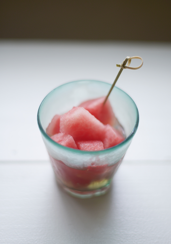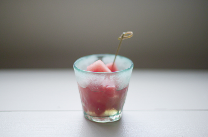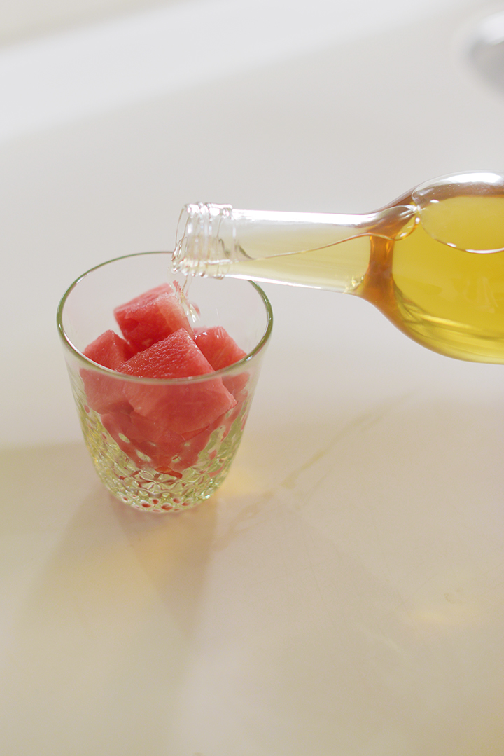 2.涼しげなロックグラスに角切りにしたスイカを入れる。(カクテルグラスがあれば雰囲気UP!)