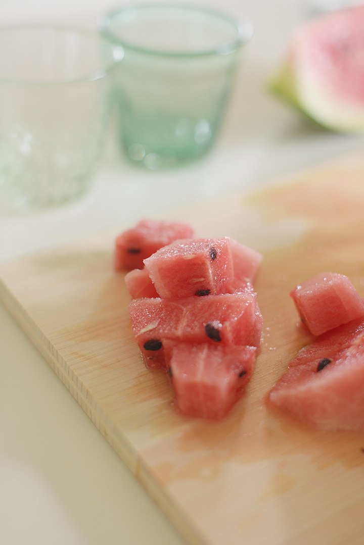 1.スイカを食べやすいサイズに四角くカットする。(種は除いておく)