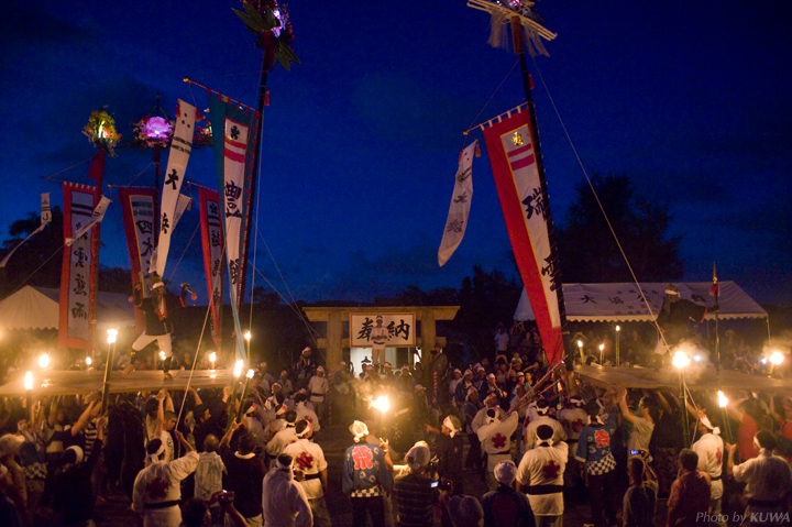 松明の炎と旗頭の提灯の灯りに、幻想的な雰囲気に包まれます。
