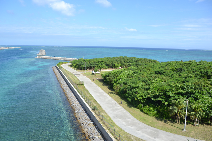左奥に見えている山影は西表島。