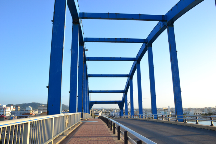 街の中心部に見える青い橋。