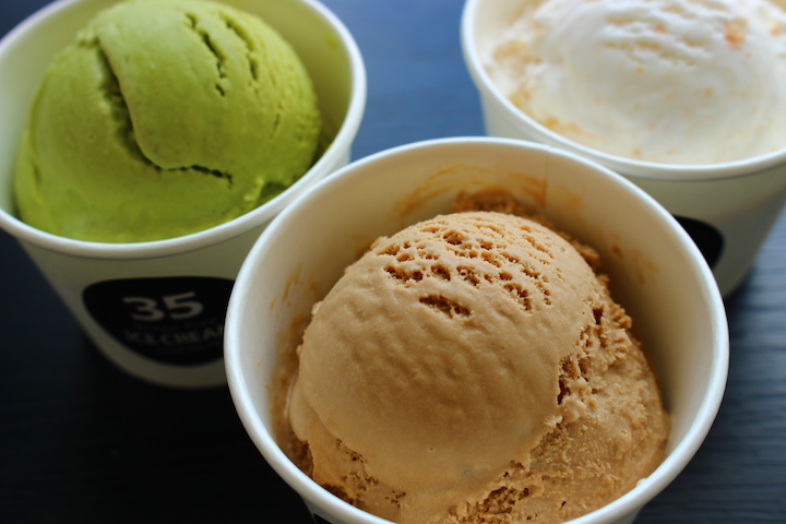 (左:沖縄県産緑茶のアイス、中央:35COFFEEのコーヒーアイス、右:ちんすこうアイス)