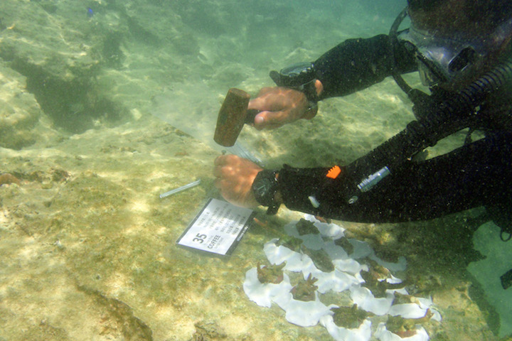 最適な場所と時期を見極め、ベビーサンゴの植え付けを行っています。