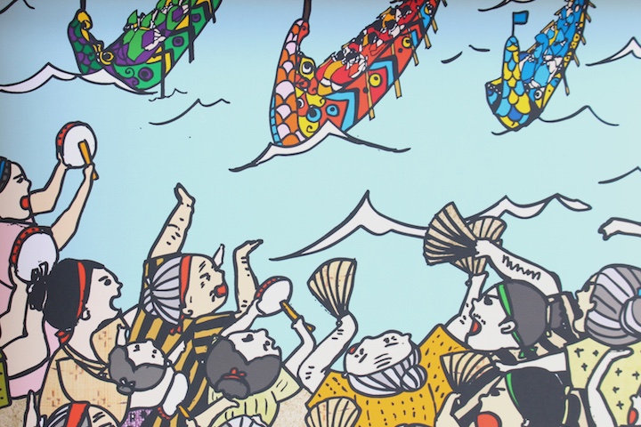 この絵は、沖縄の伝統行事を紙芝居にしたもの。旧暦の5月4日に開催されていた、ユッカヌヒー。大人たちは、ハーリーを行い、応援し、子供たちには年に一度この日に玩具を買い与えたのだそう。Savaさんは、当時の事を知るおばあさんに取材をして、戦前行われていたハーリーや、琉球玩具市、ひとつの玩具を大切にして遊んでいたことを、現代の子供たちに伝わるようにと願いをこめ描いたといいます。