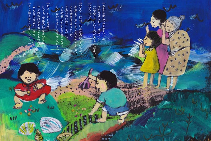 同じく伝統行事を描いた紙芝居の“サンちゃんのハマウリ”では、現代の子供とおばぁちゃんとのやりとりの中で、旧暦3月3日に行われるハマウリという、女性を中心に足や手を海に浸けて身と心を清め祈願し、潮干狩りなども行う伝統行事についてを教えてくれます。
