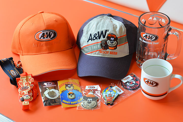店内で購入できるルーティ君やA&Wのロゴが入ったグッズも大人気で、