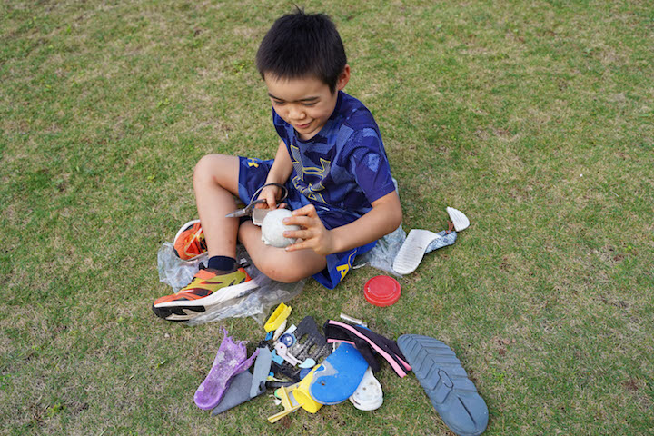 素材集めは、米原(よねはら)海岸へ。それぞれが自分の想像する椅子を作るための素材を拾い集めました。流れ着いたペットボトルの蓋も、プラスチックの破片も、貝殻や珊瑚も全てが椅子づくりの素材になります。子どもたちは青空のもと、浜辺で楽しそうに素材集めにいそしんでいました。